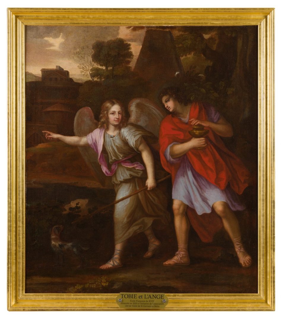 Ce remarquable tableau attribué à Jean II Decherche illustre un récit biblique : le voyage du jeune Tobie en compagnie de l’ange Raphaël pour trouver un remède afin de guérir sa future épouse Sara, possédée par un démon, et son père devenu aveugle. On voit Tobie portant dans un récipient la bile d’un poisson, le précieux médicament. Le rendu des personnages et des drapés est d’une facture très soignée. D’un éclectisme assumé, cette toile aux tonalités chaudes et recherchées se rapproche de la production de Jean II Decherche appartenant à une famille de peintres manceaux actifs aux XVII et XVIIIe siècles.